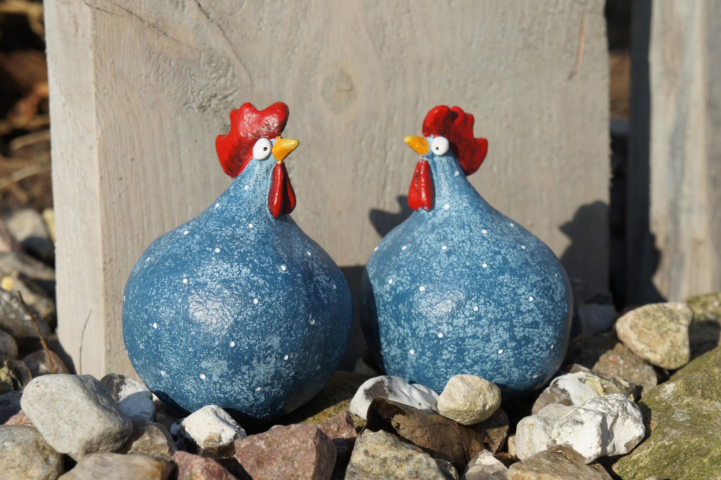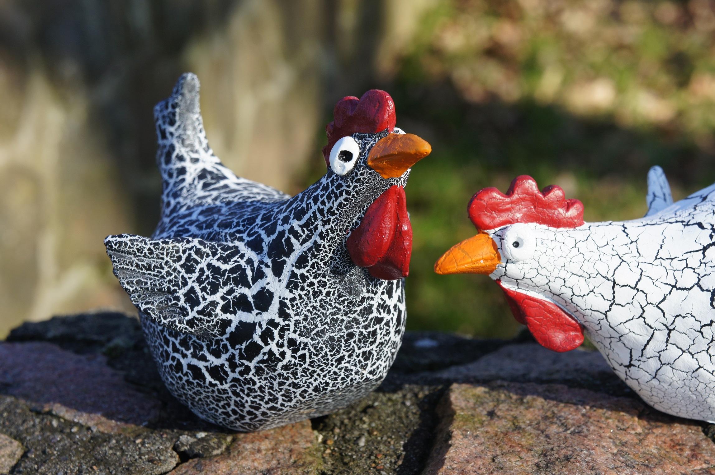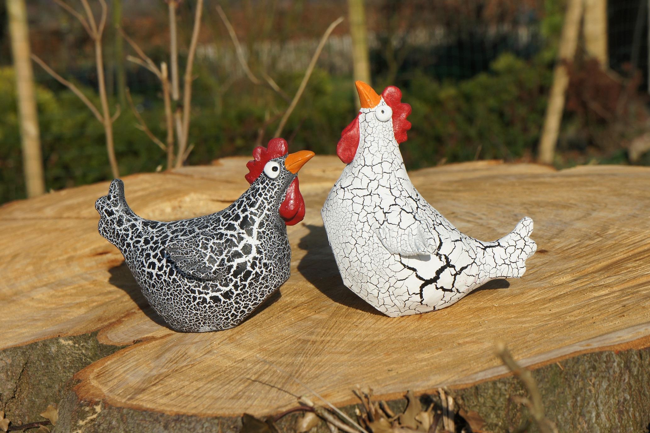Farbenfrohe Hühner und Hähne aus Polyresin (frostfest)